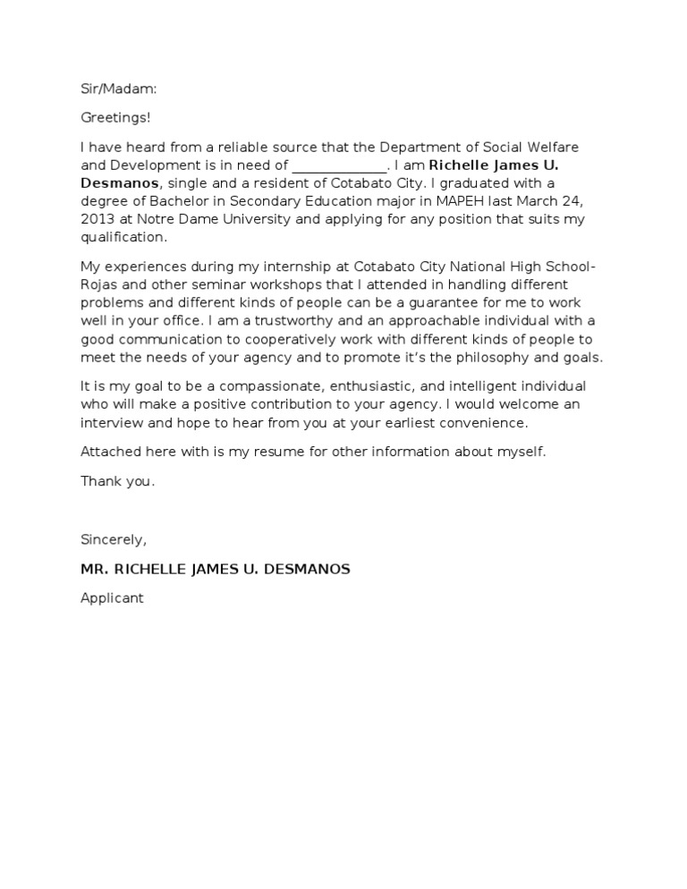 A letter of application is really important when you are about to apply for a job vacancy or an internship. General cover letter for job application this letter shows an interest in getting a job in the company without specifying a position. To review, a cover letter, simple application letter philippines no more about. An application letter is one of the first few things that you need to prepare when applying for a job. The applicant may search the potential employer's website or even call the employer to ask for the proper person to address the cover letter are two ways of finding out the name of the person to whom the letter there are no particular laws for cover letter for job applications in the philippines.